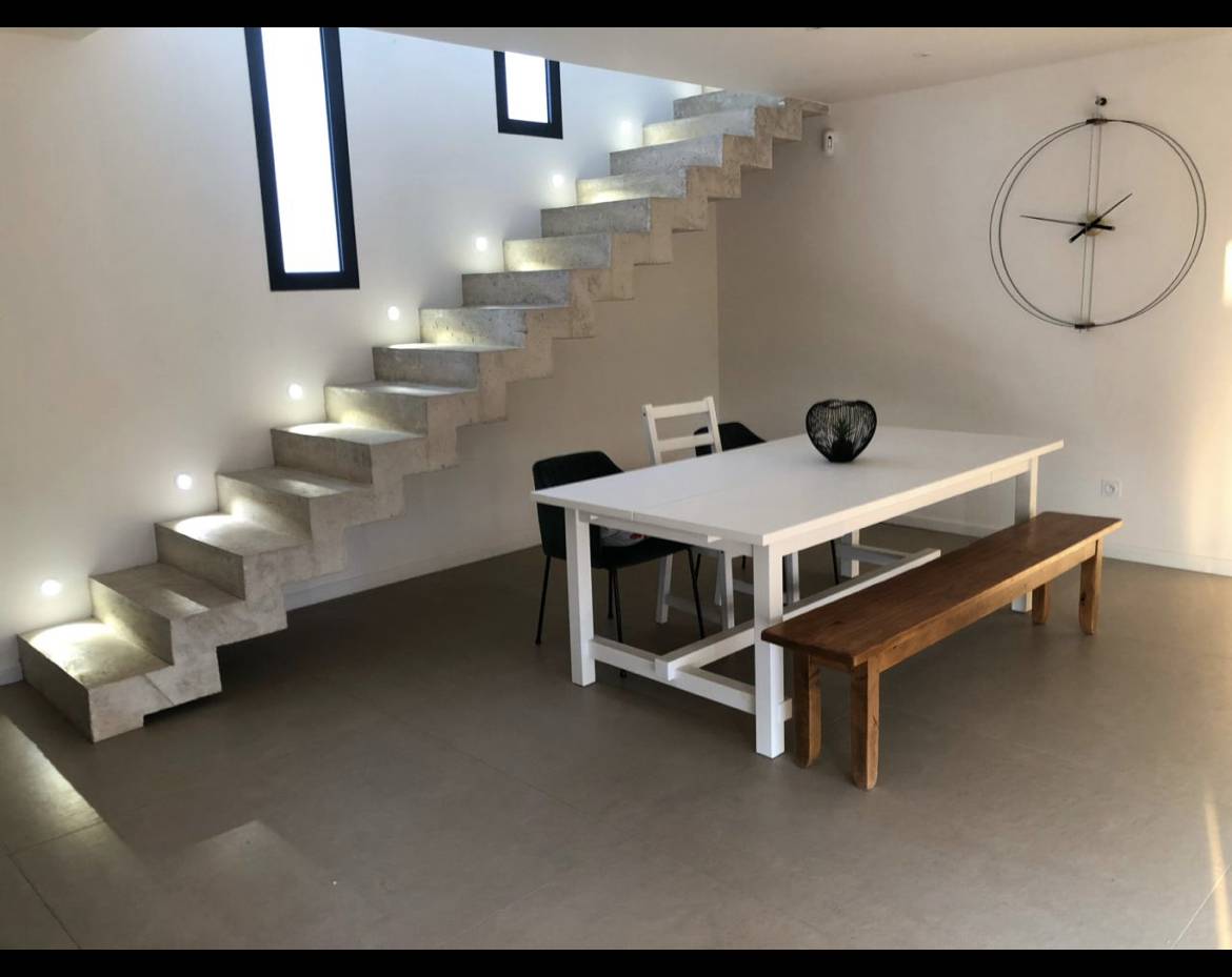 LMB Construction, spécialiste des travaux de gros œuvre et de maçonnerie, vous présente l’une de ses réalisations : un escalier intérieur à crémaillère en béton brut, conçu dans le cadre d’un projet de construction de maison contemporaine.