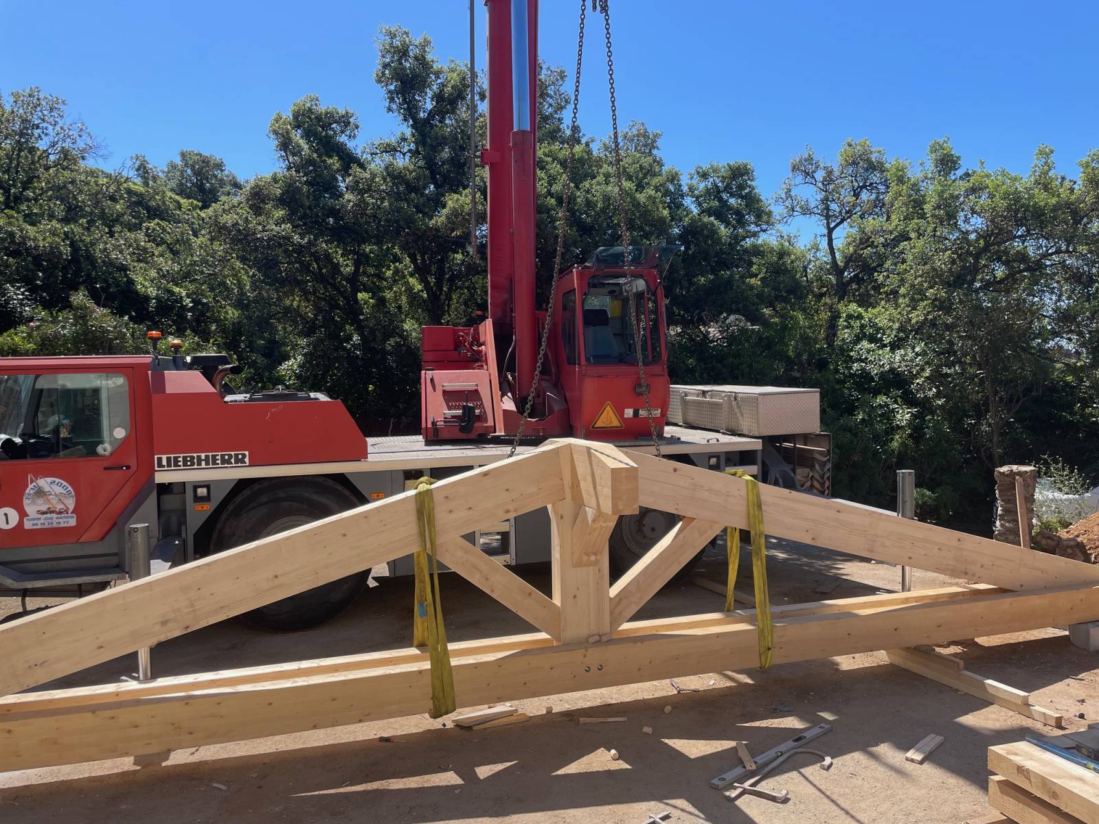 Le levage de la charpente a été réalisé à l’aide d’une grue mobile, une opération impressionnante qui exige rigueur et coordination. Chaque élément a été préfabriqué avec précision, puis posé avec méthode pour un rendu final à la fois robuste et esthétique.