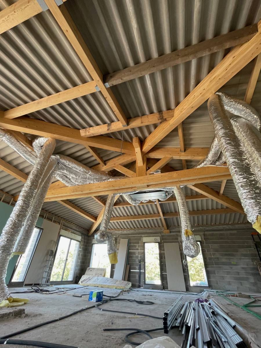 La charpente, une fois posée, révèle toute la beauté du bois apparent, parfaitement intégré sous une toiture. Les assemblages sont réalisés avec soin, renforcés par des connecteurs métalliques, garantissant solidité et durabilité. À l’intérieur, les gaines de ventilation sont en cours d’installation, préparant le bâtiment à accueillir les systèmes de climatisation et de chauffage.